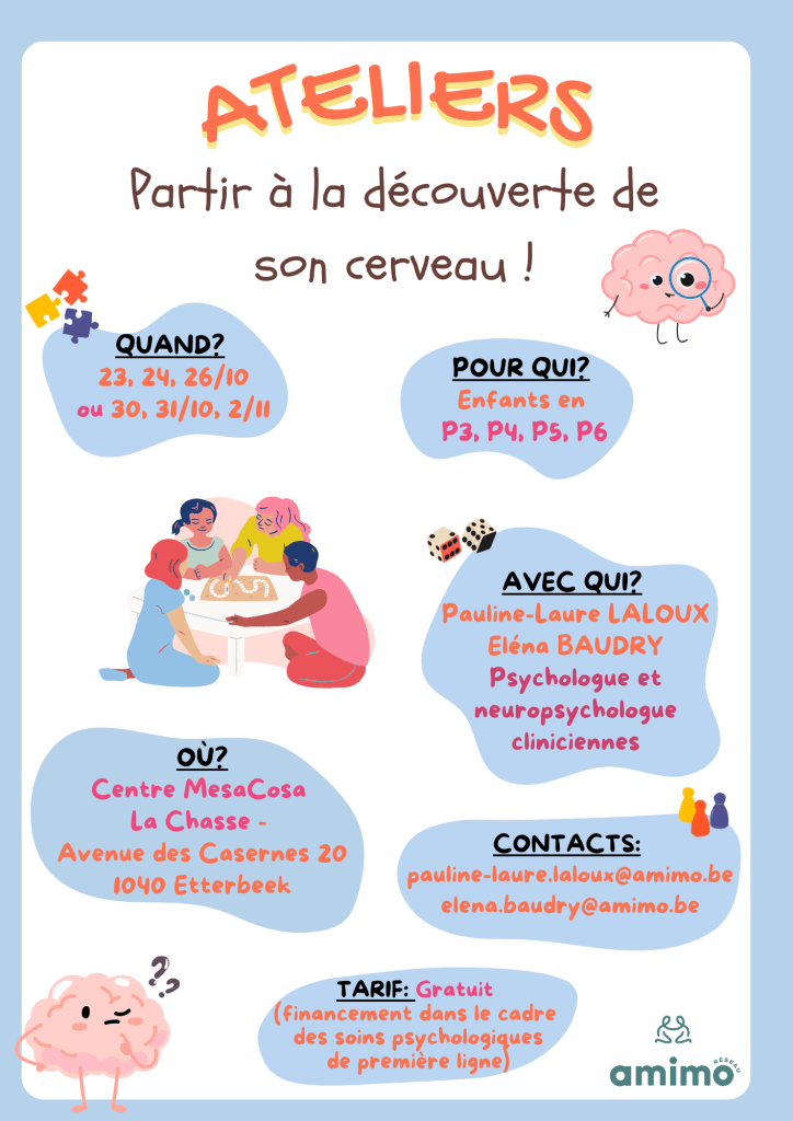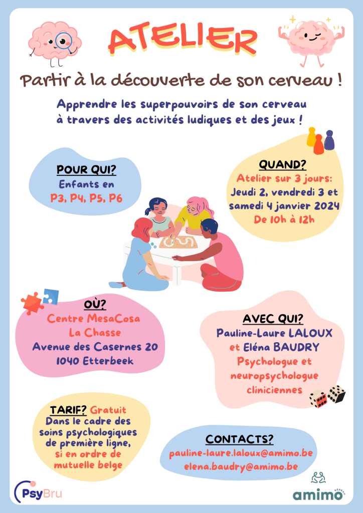 « Cet atelier est composé de 3 séances pour permettre aux enfants de découvrir de manière amusante les différentes fonctions cognitives, telles que l’attention, la mémoire et les fonctions exécutives. À travers des activités ludiques, des outils variés et la psychoéducation, les enfants apprendront à mieux comprendre le fonctionnement de leur cerveau »